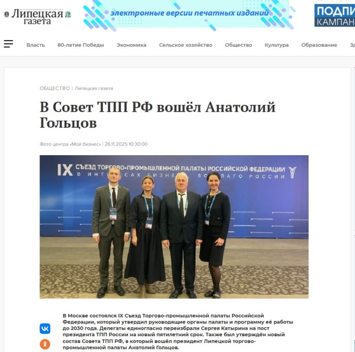 Липецкая газета: «В Совет ТПП РФ вошёл Анатолий Гольцов»