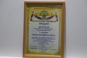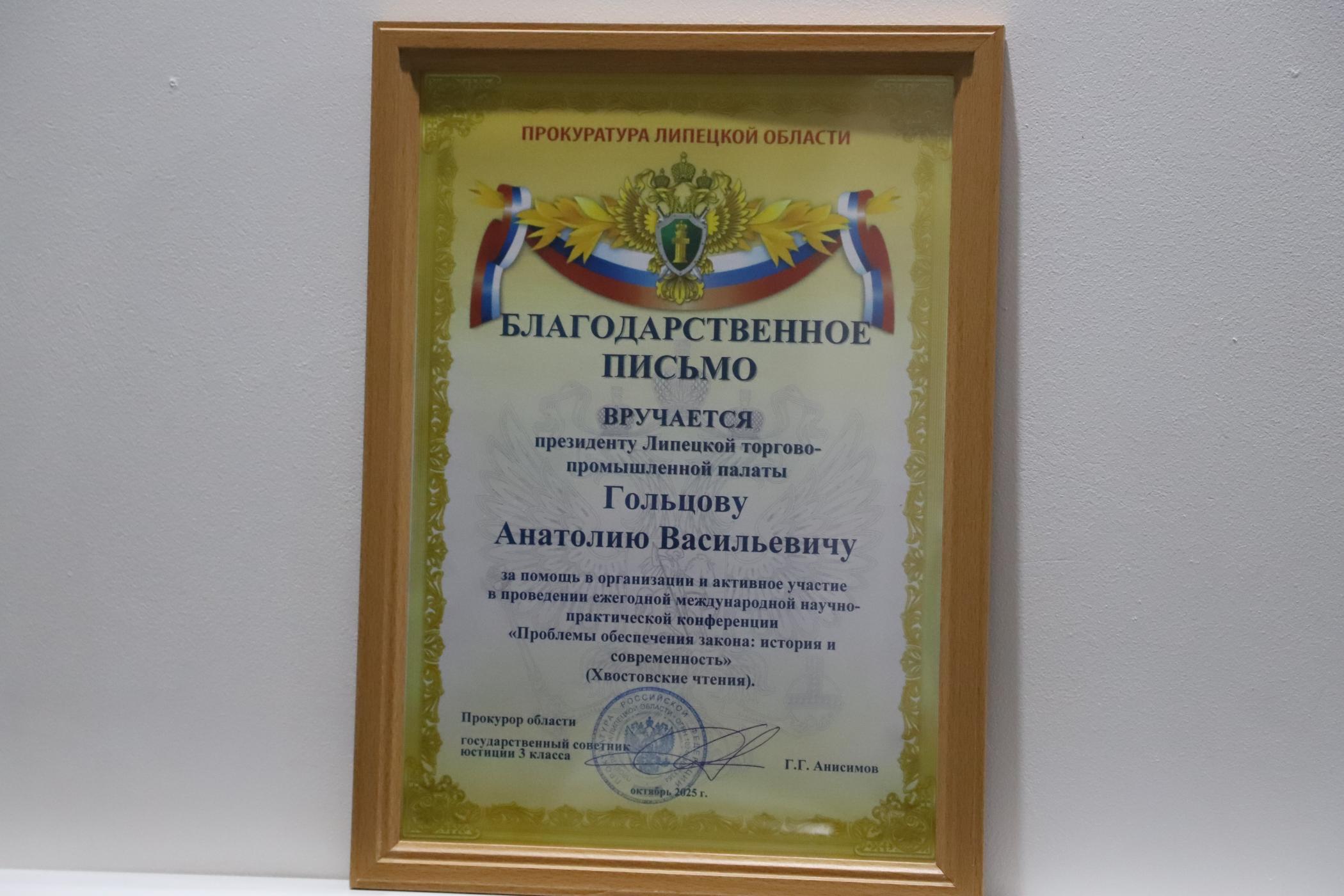 Прокурор Липецкой области Геннадий Анисимов направил благодарственное письмо президенту Липецкой торгово-промышленной палаты, директору АНО «ЦПЭ Липецкой области» (центр «Мой бизнес») Анатолию Гольцову. Высокая оценка была выражена за значительный вклад в организацию и проведение V Международной научно-практической конференции «Проблемы обеспечения закона: история и современность» (Хвостовские чтения).