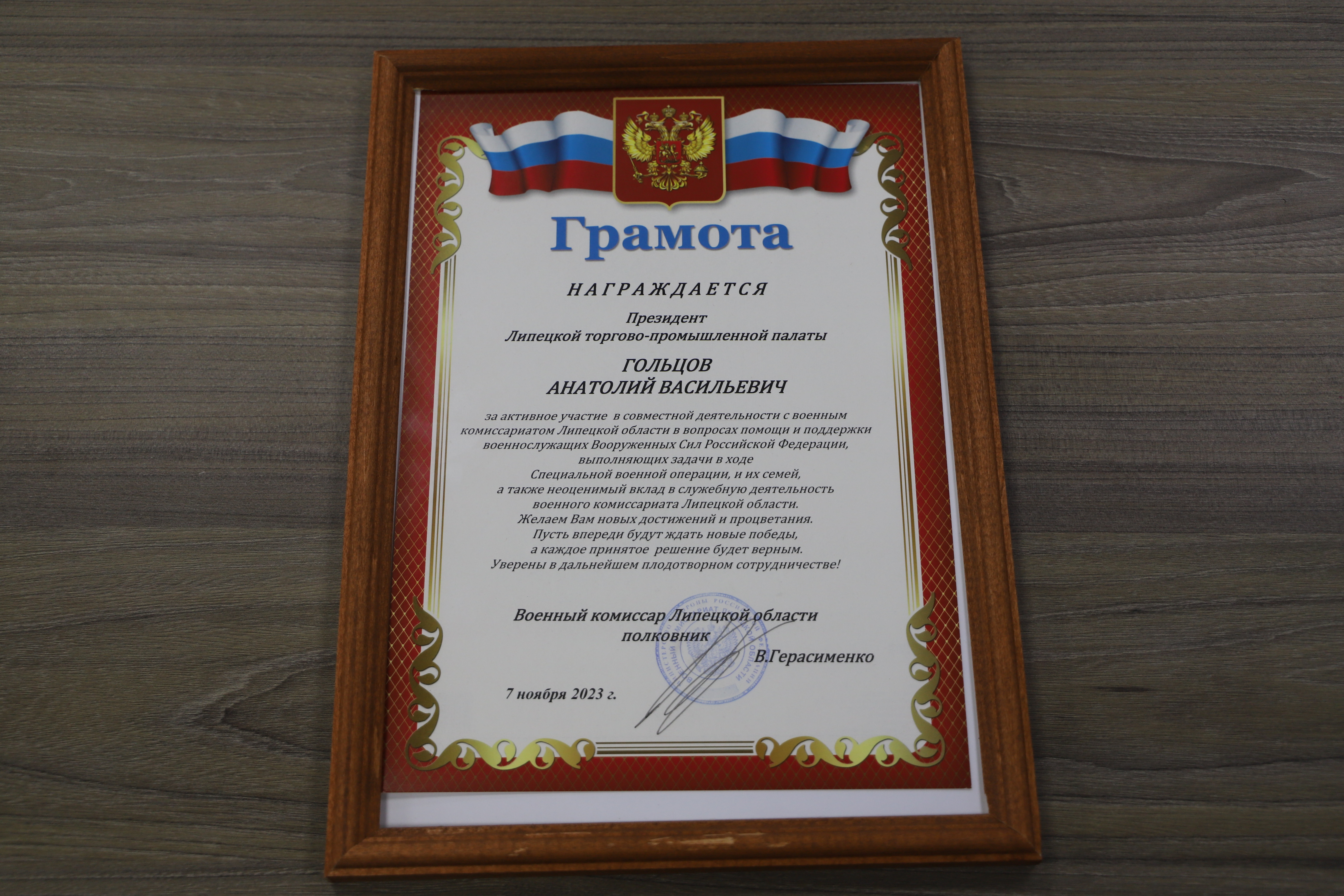 Анатолия Гольцова наградили Почетной грамотой за активное участие в вопросах поддержки военнослужащих Вооруженных Сил РФ в зоне СВО от имени военного комиссара Липецкой области Валерия Герасименко. Также Анатолий Васильевич был отмечен Благодарственным письмом от Липецкого авиацентра за активную работу и личный вклад в поддержке военнослужащих-липчан, участвующих в СВО.