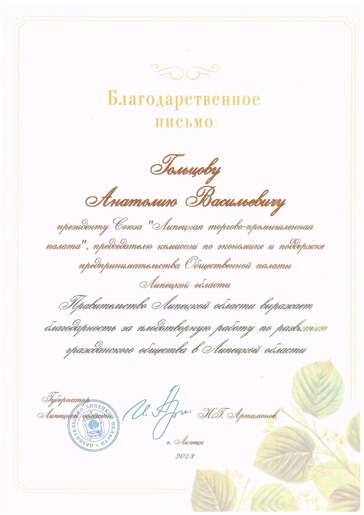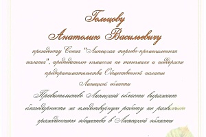 По итогам доклада Анатолию Гольцову были вручены благодарственные письма "За плодотворную работу по развитию гражданского общества в Липецкой области" от Губернатора Липецкой области Игоря Артамонова и "За активную общественную деятельность" от председателя Липецкого областного Совета депутатов Дмитрия Аверова.