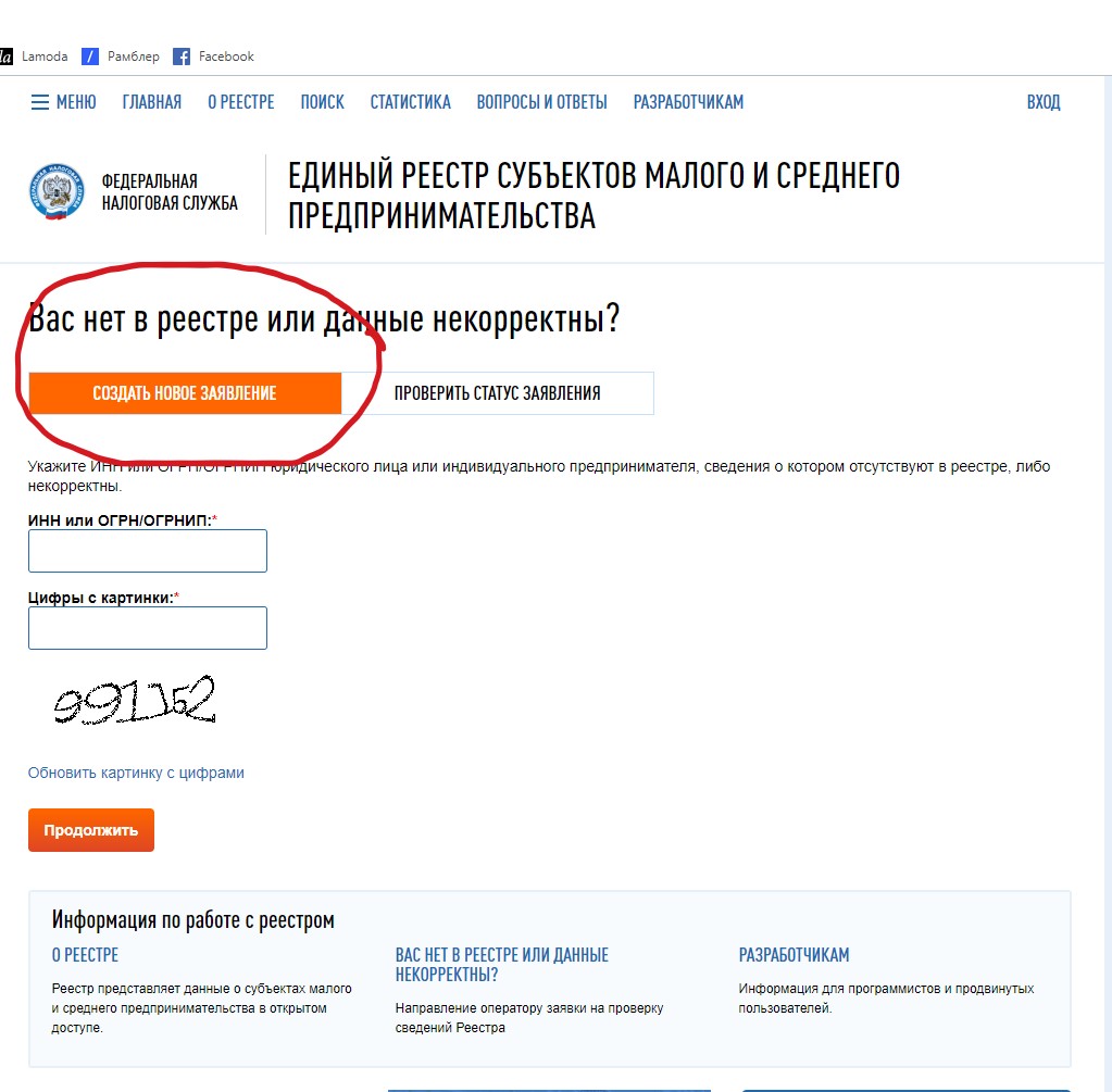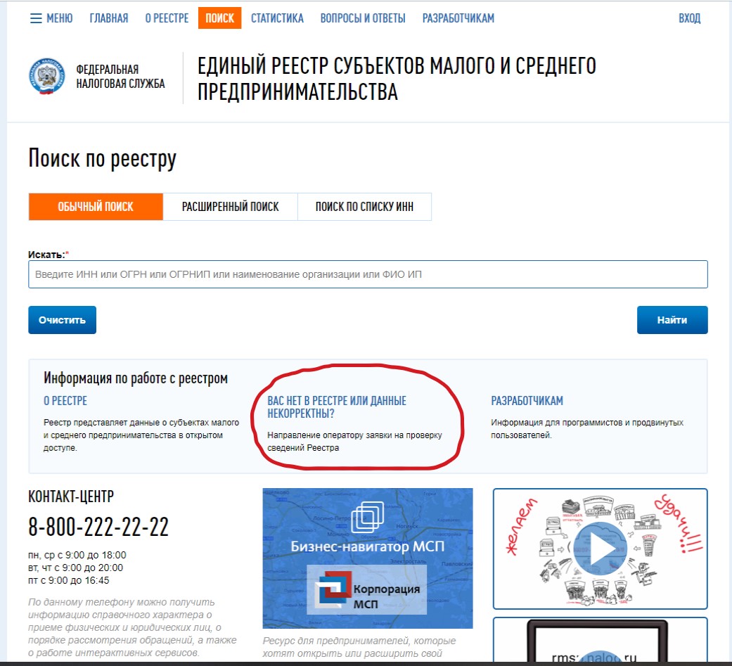 В случае ошибочного исключения из Реестра либо некорректного указания данных субъекта МСП необходимо сообщить об этом через специальную форму на сайте реестра.