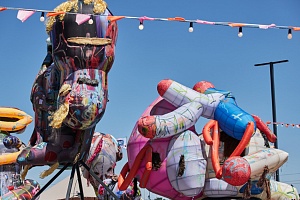 «Эта инсталляция из комбинации аэрофигуры и металлоконструкции родилась из размышлений об уличном паблик-арте. Массы, поднятые над землей, создают дистанцию со зрителем и благодаря ей становятся более заметными. На этапе установки мне понравилось, как скульптуры оказались вплетены в пространство завода, создавая атмосферу семейного фестиваля», — отметил Горшков.