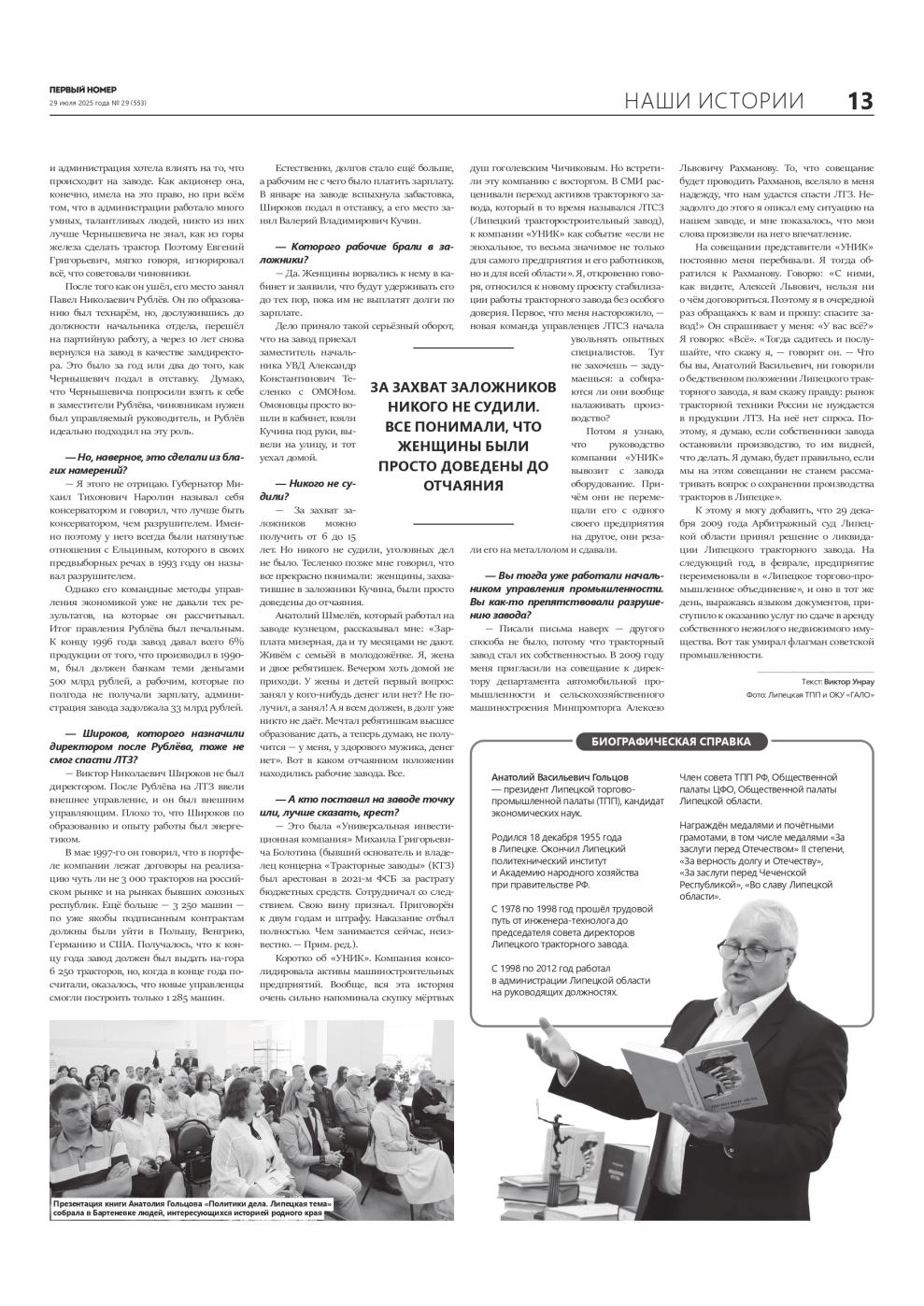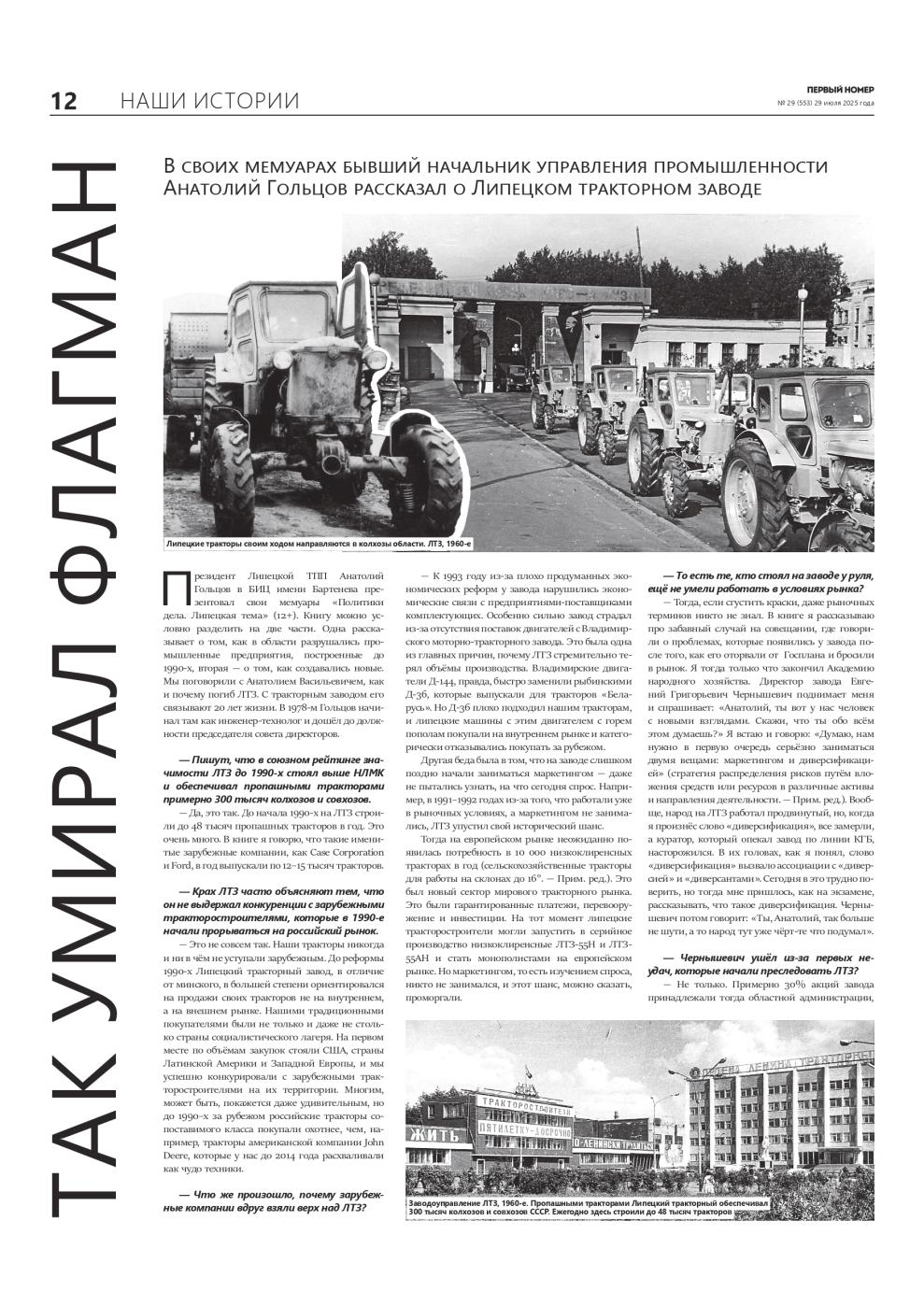 Президент Липецкой ТПП, директор АНО «ЦПЭ Липецкой области» (центр «Мой бизнес») Анатолий Гольцов в БИЦ имени Бартенева презентовал свои мемуары «Политики дела. Липецкая тема» (12+). Книгу можно условно разделить на две части. Одна рассказывает о том, как в области разрушались промышленные предприятия, построенные до 1990-х, вторая — о том, как создавались новые. Мы поговорили с Анатолием Васильевичем, как и почему погиб ЛТЗ. С тракторным заводом его связывают 20 лет жизни. В 1978-м Гольцов начинал там как инженер-технолог и дошёл до должности председателя совета директоров.