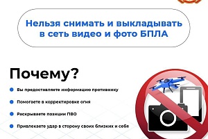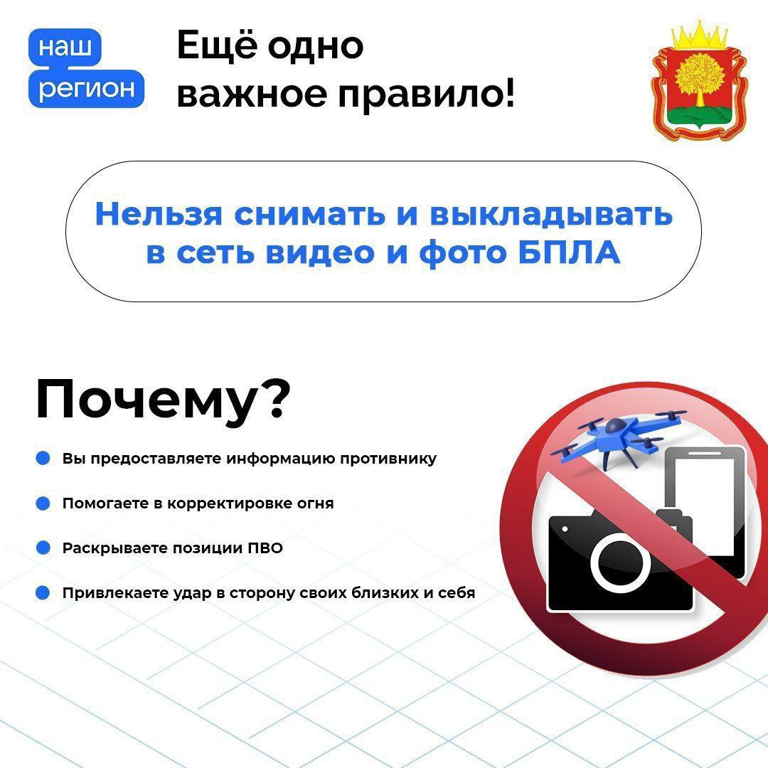 Важно‼️ Не снимайте БПЛА! Не подвергайте себя опасности. Не публикуйте фото и видео с места падения беспилотников и кадры о последствиях атак. Эти фото и видеоматериалы могут быть использованы противником для корректировки огня.
