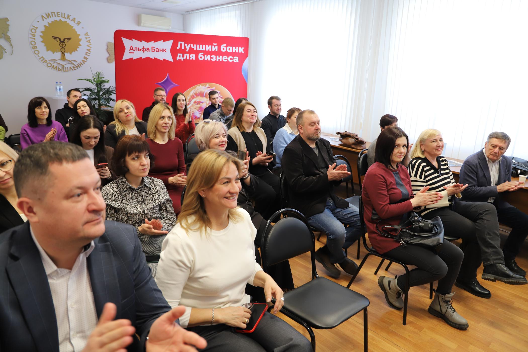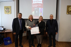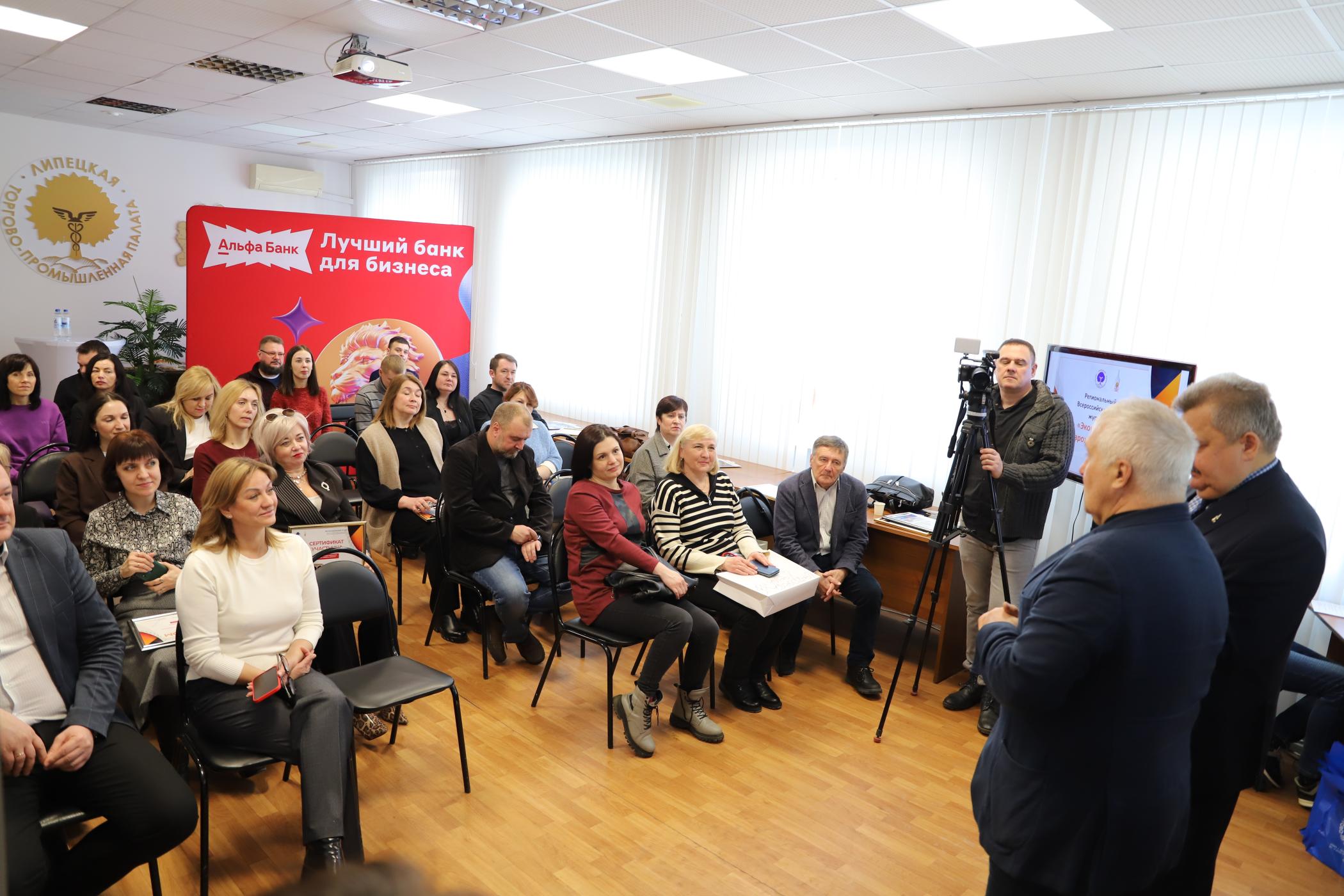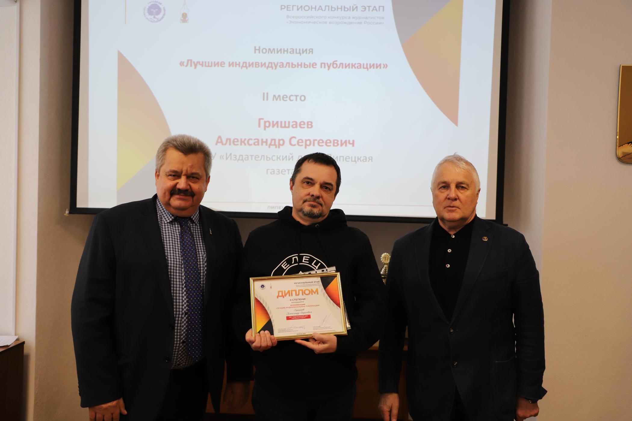 Президент Липецкой торгово-промышленной палаты Анатолий Гольцов и председатель Союза журналистов Липецкой области Петр Игнатов вручили дипломы и памятные подарки победителям и участникам конкурса от партнёра мероприятия — Альфа-Банка.