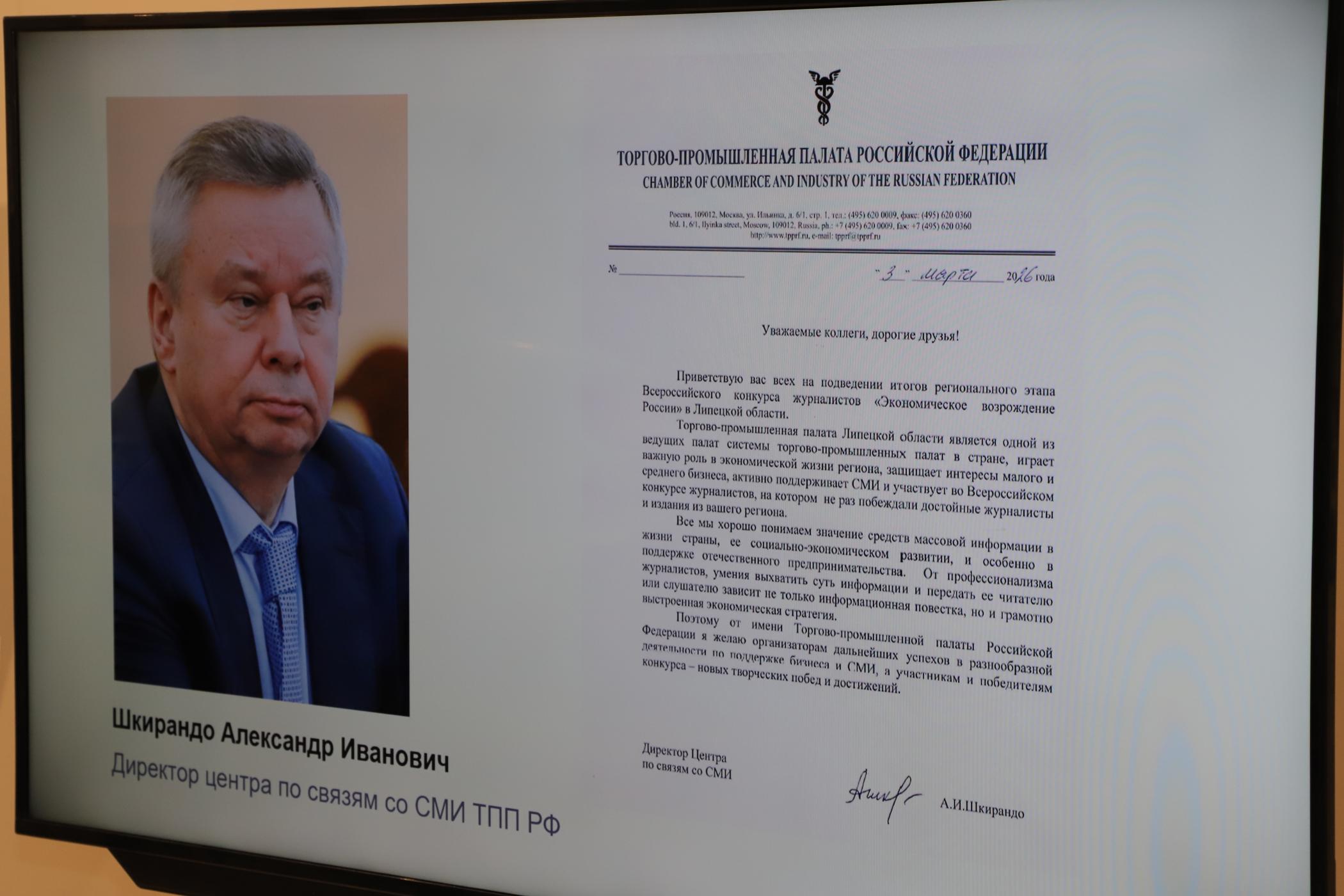 «Липецкая ТПП является одной из ведущих палат в системе торгово-промышленных палат страны, играет важную роль в экономической жизни региона, защищает интересы малого и среднего бизнеса, активно поддерживает СМИ и участвует во Всероссийском конкурсе журналистов, на котором не раз побеждали достойные журналисты и издания из вашего региона. От имени ТПП РФ желаю организаторам дальнейших успехов в деятельности по поддержке бизнеса и СМИ, а участникам и победителям конкурса — новых творческих побед и достижений», — говорится в приветствии.