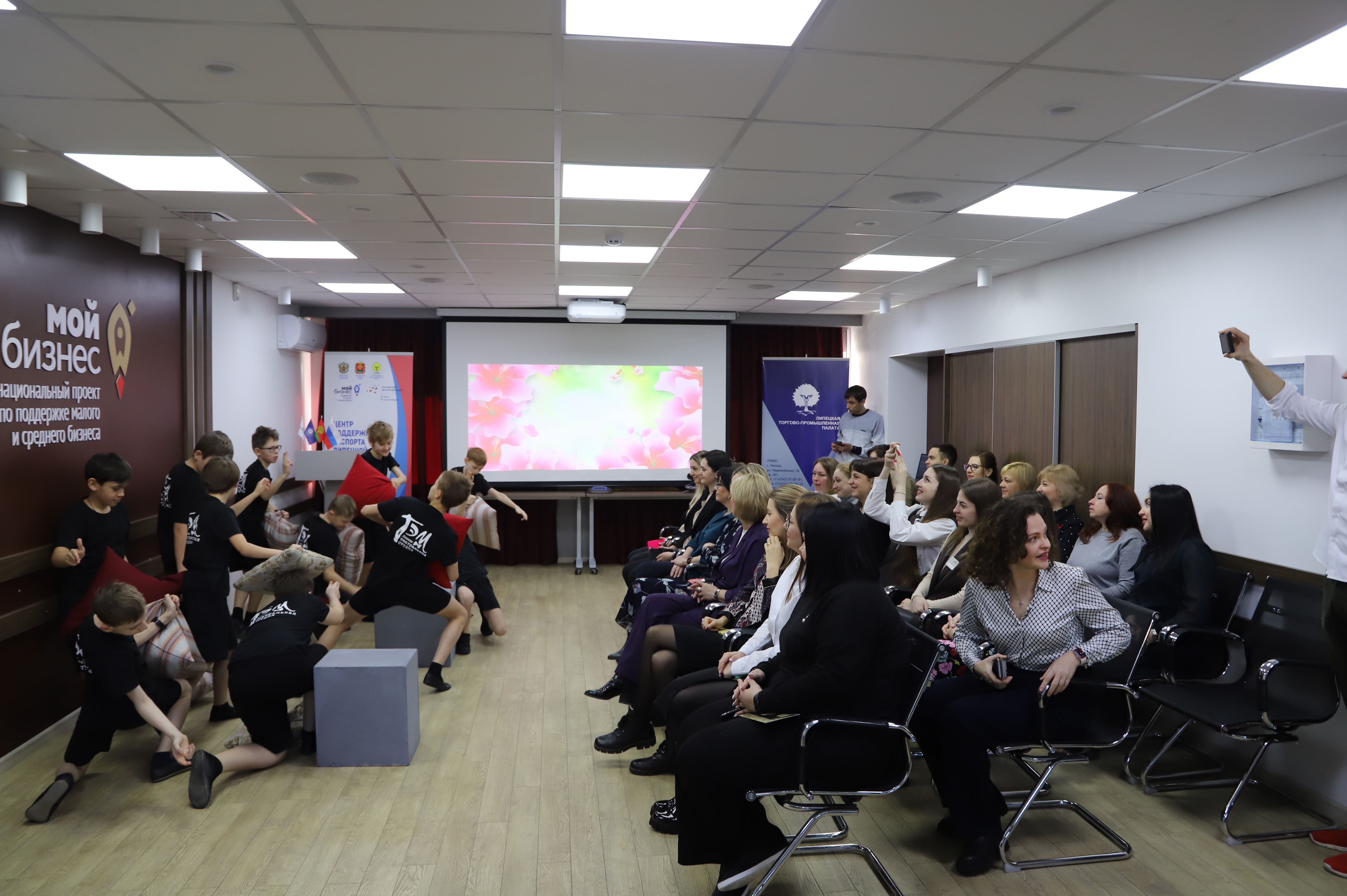 Накануне Международного женского дня воспитанники театральной студии "ТЭМ" поздравили сотрудниц центра "Мой бизнес" с праздником спектаклем "Алешкины мысли".