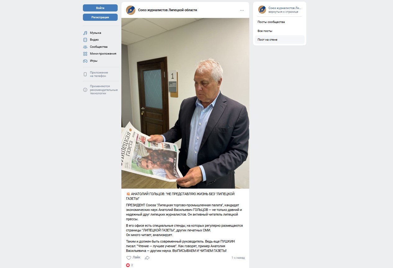 Союз журналистов Липецкой области поблагодарил директора АНО «ЦПЭ Липецкой области», президента Липецкой ТПП Анатолия Гольцова за его преданность «Липецкой газете».