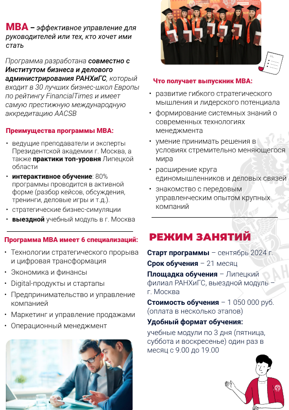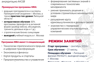 Впервые Липецкий филиал Президентской академии дает возможность для бизнеса и руководителей получить Топ-образование MBA (Master of Business Administration) от ведущей бизнес-школы РАНХиГС (которая входит в топ-30 бизнес-школ Европы по рейтингу Financial Times).
