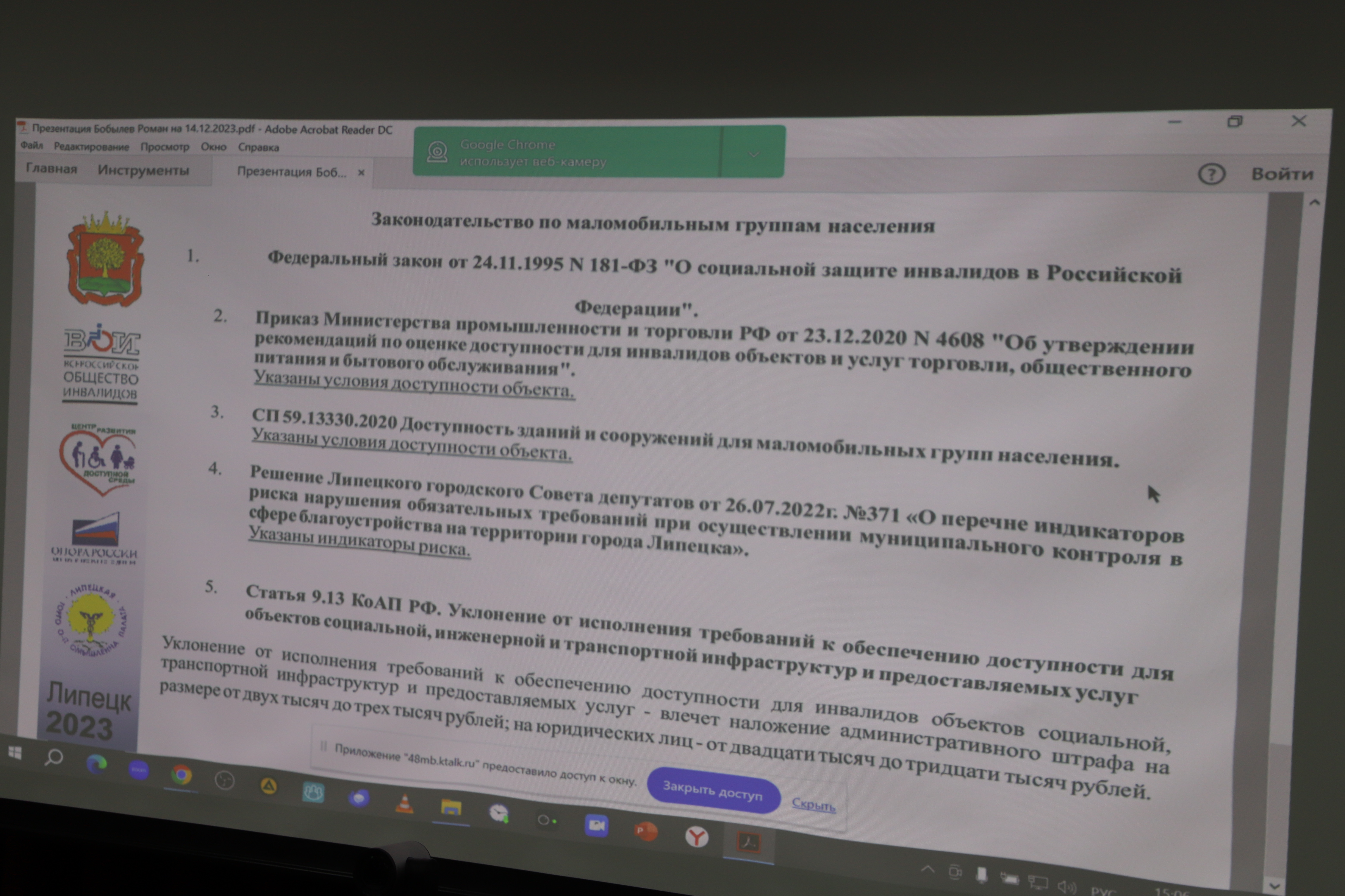 14 декабря в центре «Мой бизнес» в Липецке обсудили проблемные вопросы безбарьерной среды в предприятиях торговли, общепита и услуг региона. За круглым столом собрались представители Липецкой торгово-промышленной палаты, областного и городского управлений потребительского рынка, регионального отделения «Опора России», аппарата Уполномоченного по защите прав предпринимателей Липецкой области, Центра социальной поддержки маломобильных граждан. В формате видеоконференцсвязи говорили с руководителями торговых сетей и предприятий общественного питания о доступной среде и комфортных условиях для маломобильных граждан.