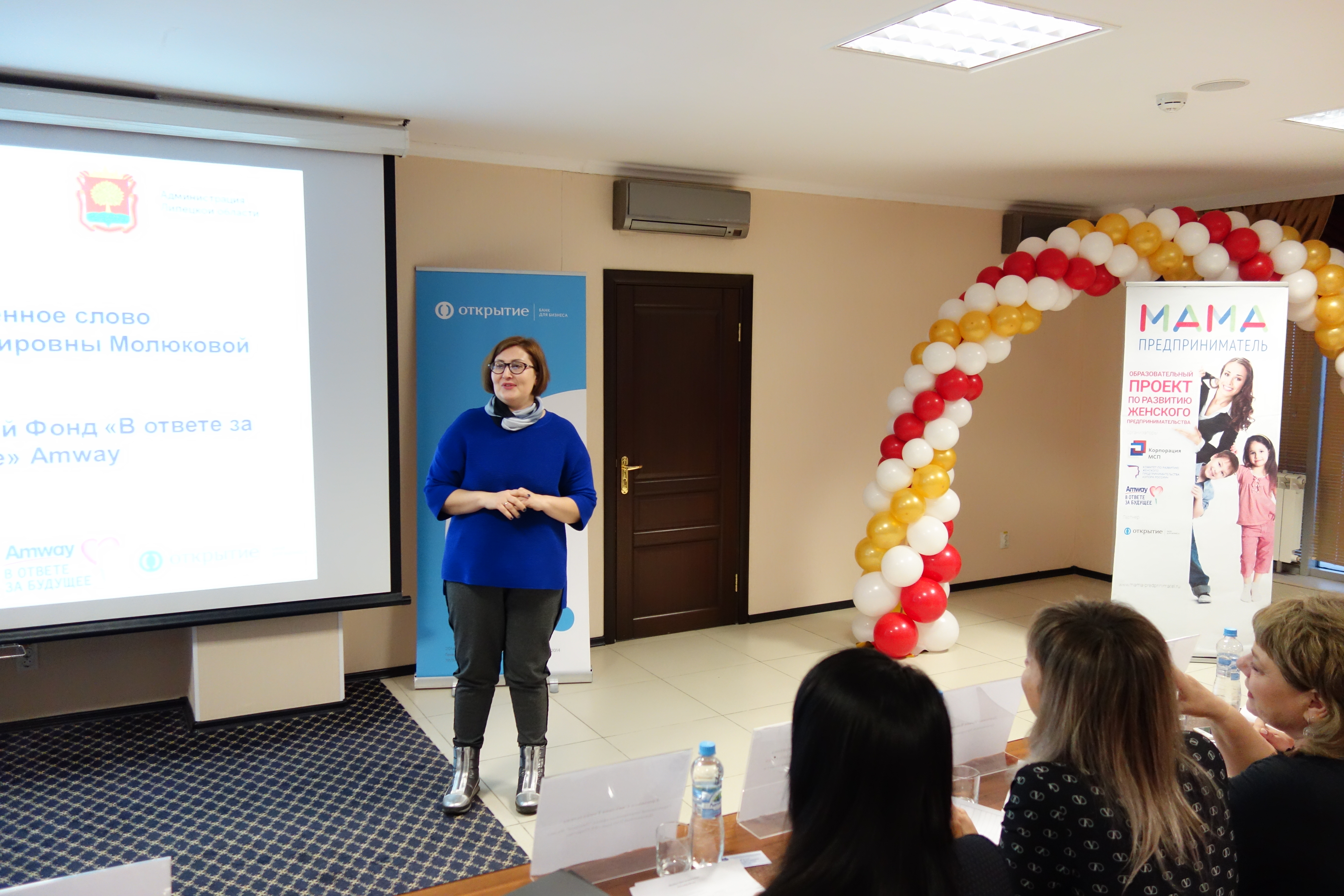 Федеральный образовательный проект «Мама-предприниматель» дает возможность женщинам в декретном отпуске, мамам несовершеннолетних детей, а также женщинам, состоящим на учете в службе занятости, бесплатно пройти пятидневный тренинг, получить ценные советы экспертов и реализовать свои бизнес-идеи. Проект реализуется Федеральной корпорацией по развитию малого и среднего предпринимательства (Корпорация МСП) и Комитетом по развитию женского предпринимательства «ОПОРЫ РОССИИ». Соорганизатором и грантодателем выступает Благотворительный фонд Amway «В ответе за будущее». Официальным партнером мероприятия выступает Банк «Открытие».